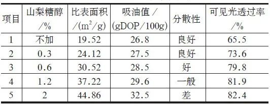 在制備納米碳酸鈣過程中分別添加0%、0.3%、0.6%、1.2%、2%(按納米碳酸鈣干基含量) 山梨糖醇,考察不同山梨糖醇用量對納米碳酸鈣及薄膜性能的影響(2)。由表可知:不加晶型控制劑山梨糖醇的空白樣,比表面積小,透明性較差;隨著山梨糖醇用量增加后,粒子變小,比表面積增大,有利于光線繞射,透明率提高;但是比表面積達(dá)到一定程度,吸油值增加,加工阻力增大,粒子之間作用力強(qiáng),造成分散性下降。綜合考慮,確定山梨糖醇用量為納米碳酸鈣的0.6%。