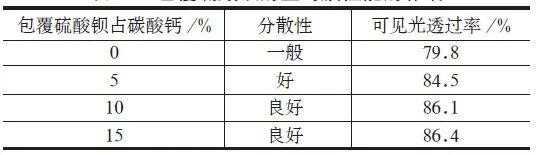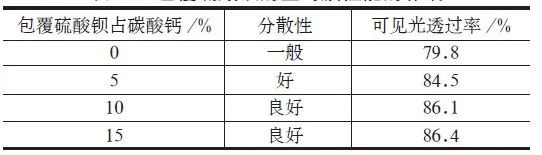 將納米碳酸鈣采用0%、5%、10%、15%(按納米碳酸鈣干基的) 等不同量的硫酸鋇進(jìn)行包覆,考察硫酸鋇用量對薄膜性能的影響。納米碳酸鈣的形態(tài)為立方體,加入硫酸鋇包覆納米碳酸鈣主要目的是形成具有海棉結(jié)構(gòu)的沉積層,產(chǎn)生一定的空隙率,改善分散性,提升光的透光率,進(jìn)而提高透明性。由表可知:隨著硫酸鋇用量的增加,納米碳酸鈣被硫酸鋇包覆,分散性和光透光率變好,當(dāng)用量達(dá)到10% 以上后,透光率變化不大,綜合考慮成本因素,確定硫酸鋇用量為納米碳酸鈣干基量的10%。