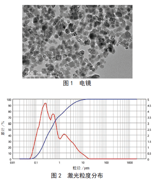 本試驗(yàn)制備的納米碳酸鈣與GB/T 19590-2011 中橡膠塑料用納米碳酸鈣指標(biāo)對比。從表中可以看出,本試驗(yàn)納米碳酸鈣達(dá)到I 型標(biāo)準(zhǔn),從圖1 電鏡看平均粒徑為40nm,圖2 激光粒徑儀測試D50 為0.43μm,D97 為6.6μm,具有良好的分散性。