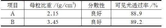 采用表1 配方,將本試驗(yàn)制備的納米碳酸鈣(A)與納米硫酸鋇(B) 采用同樣份數(shù)進(jìn)行混料、造粒制備母粒,吹膜制備薄膜,并檢測其透明性和分散性(表6)。從表6 可以看出,采用本試驗(yàn)制成的納米碳酸鈣,制備的薄膜在分散性及透光率等性能上達(dá)到納米硫酸鋇指標(biāo),而母粒比重2.15g/cm3 相比納米硫酸鋇母粒比重小50% 以上,同樣量的母粒吹膜面積大,可降低母粒的生產(chǎn)成本,具有良好的市場前景。