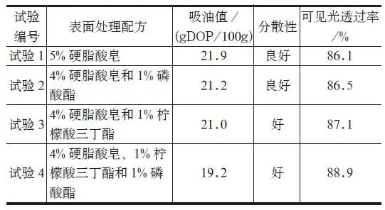 添加5%~6% 的不同表面處理劑進(jìn)行試驗(yàn),考察其對納米碳酸鈣及薄膜性能的影響。從下表可以看出,試驗(yàn)1中:硬脂酸皂中親水的COO- 基與Ca2+ 結(jié)合形成硬脂酸鈣,包覆在納米碳酸鈣表面形成包覆層,可以提高分散性和降低吸油值。試驗(yàn)2 中:磷酸酯是以磷為中心,具有烷氧基的偶聯(lián)劑,由多個(gè)親油長碳鏈基團(tuán)組成,在硬脂酸皂溶液中均勻分散后,與硬脂酸皂一起包覆在納米碳酸鈣表面,可降低吸油值,提高分散性和光透過率。試驗(yàn)3 中:檸檬酸三丁酯是一種良好地增塑劑,與PE 母粒具有相容性好、增塑效率高、耐候性強(qiáng),檸檬酸三丁酯溶解于硬脂酸皂中,吸附到納米碳酸鈣表面,提高納米碳酸鈣與PE 的相溶性,提高分散性和光透過率。試驗(yàn)4 中:通過硬脂酸皂溶解磷酸酯和檸檬酸三丁酯,包覆到納米碳酸鈣表面,硬脂酸皂可提高分散性,磷酸酯偶聯(lián)劑具有增強(qiáng)效果,檸檬酸三丁酯增加相溶性,可以降低吸油值,提高分散性和提高光透過率。綜合來看,試驗(yàn)4 配方具有低的吸油值、好的分散性和可見光透過率。