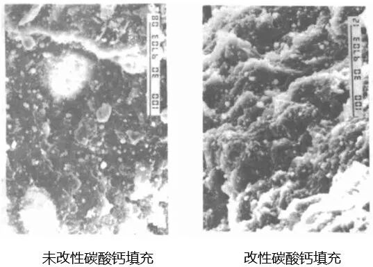 改性碳酸鈣的補強性能要遠(yuǎn)遠(yuǎn)優(yōu)于未改性碳酸鈣,其補強性主要是由于表面改性劑是具有兩親基團的有機物,即具有親水基團和親油基團,表面改性劑通過兩個基團將碳酸鈣和橡膠緊密結(jié)合在一起,這有利于提高橡膠的物理機械性能,改善加工性能,并提高制品的延伸性、拉伸強度、撕裂強度等性能。