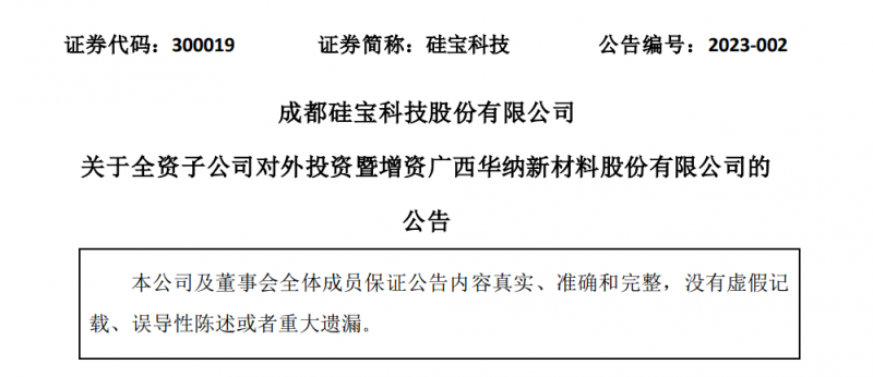 1月6日,硅寶科技發(fā)布公告稱,為進(jìn)一步提高公司在有機(jī)硅橡膠行業(yè)的競爭優(yōu)勢,全資子公司硅寶投資擬以3000萬元對廣西華納新材料股份有限公司進(jìn)行增資,增資完成后公司將取得目標(biāo)公司3.5293%的股權(quán)。本次增資款專項用于目標(biāo)公司擴(kuò)產(chǎn)及日常生產(chǎn)經(jīng)營。