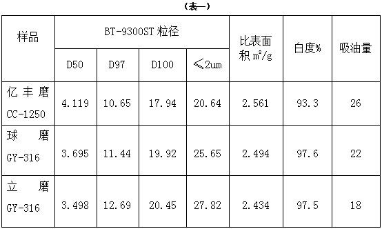 從表一中的數(shù)據(jù)可以看出,工藝不同的三種碳酸鈣,細(xì)度都是差不多的,有差別的主要在于吸油值會有不同,億豐磨產(chǎn)品的吸油值最大,立磨產(chǎn)品的最小,球磨產(chǎn)品居中;