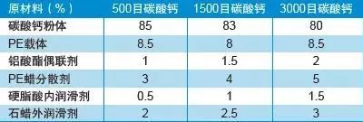 除了樹脂和碳酸鈣之外配方中必須要添加的助劑有鋁酸酯偶聯(lián)劑、聚合物蠟類分散劑、潤滑劑等。一般無機粉體越細(xì),上述其加入量相對增加,具體見表2所示。