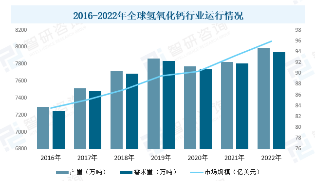 隨著工業(yè)現(xiàn)代化的快速發(fā)展以及各國(guó)對(duì)環(huán)境保護(hù)的日益重視,氫氧化鈣已得到廣泛應(yīng)用,如石油化工行業(yè)、醫(yī)藥食品行業(yè)、精細(xì)化工領(lǐng)域、環(huán)保領(lǐng)域等,消耗量逐年增加。在需求增長(zhǎng)的驅(qū)動(dòng)下,近年來(lái)全球氫氧化鈣行業(yè)發(fā)展形勢(shì)向好,行業(yè)規(guī)模也隨之穩(wěn)步提升。據(jù)資料顯示,2022年全球氫氧化鈣產(chǎn)量約為7990萬(wàn)噸,同比增長(zhǎng)2.1%;需求量約為7939萬(wàn)噸,同比增長(zhǎng)1.7%;市場(chǎng)規(guī)模約為95.9億美元,同比增長(zhǎng)2.9%。