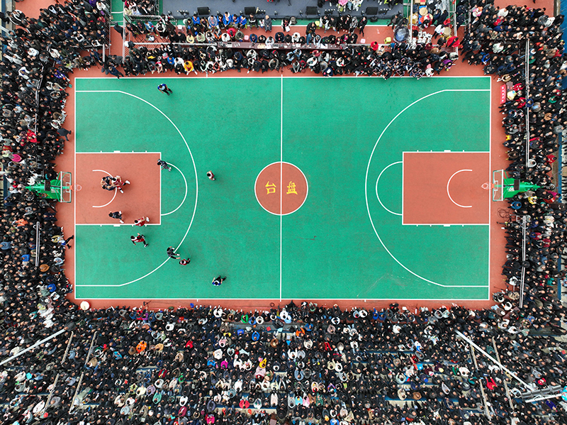 這是2023年3月27日在貴州省黔東南州臺江縣臺盤村拍攝的貴州省首屆“美麗鄉(xiāng)村”籃球聯(lián)賽總決賽比賽現(xiàn)場(無人機(jī)照片)。新華社記者 歐東衢 攝