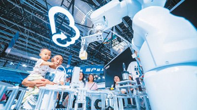 9月6日,2023中國國際數(shù)字經(jīng)濟博覽會在河北省石家莊市開幕,圖為小朋友在博覽會上參觀工業(yè)機器人。