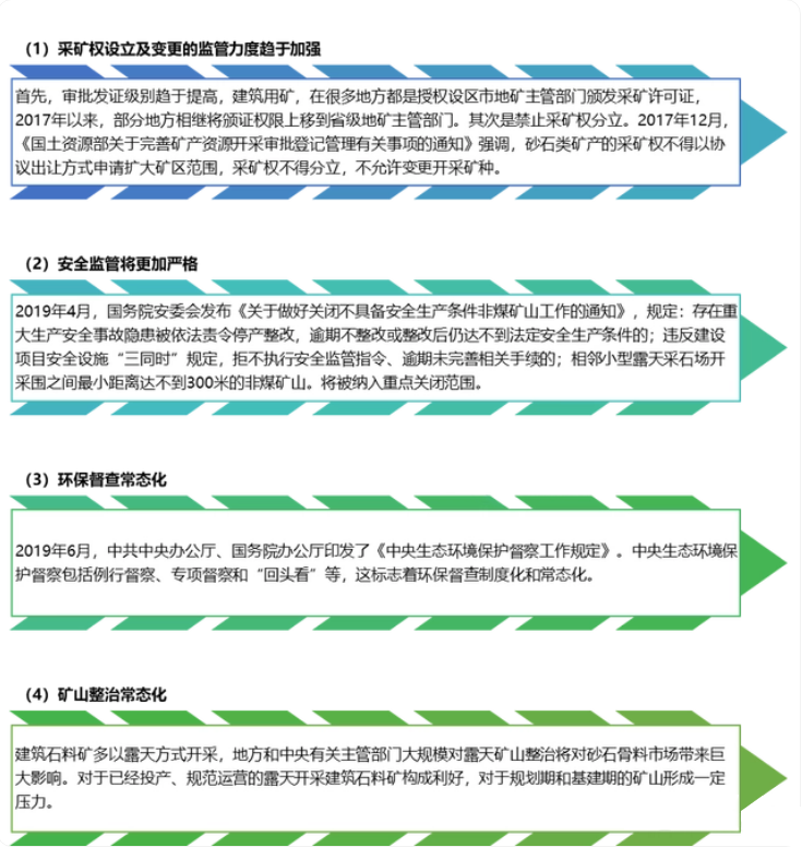 1、石灰石礦山采選行業(yè)發(fā)展概況 石灰石是以石灰?guī)r作為礦物原料的商品名稱,石灰石作為重要的建筑材料有著悠久的開采歷史,在現(xiàn)代工業(yè)中,石灰石是制造水泥、石灰、電石的主要原料,是冶金工業(yè)中不可缺少的熔劑灰?guī)r,優(yōu)質(zhì)石灰石經(jīng)超細(xì)粉磨后,被廣泛應(yīng)用于造紙、橡膠、油漆、涂料、醫(yī)藥、化妝品、飼料等產(chǎn)品的制造中。 石灰石礦主要指石灰?guī)r,是常見的一種非金屬礦產(chǎn),除上海、香港、澳門外,在各省、直轄市、自治區(qū)均有分布,根據(jù)自然資源部統(tǒng)計(jì)數(shù)據(jù),全國生石灰?guī)r分布面積達(dá)43.8萬平方公里(未包括西藏和臺(tái)灣),約占國土面積的1/20。 近二十年來,受到下游國家基建快速發(fā)展的拉動(dòng),石灰石礦山采選業(yè)也獲得迅速發(fā)展。我國石灰石礦山采選業(yè)正由粗放式開采向集約式發(fā)展轉(zhuǎn)型,機(jī)制砂石逐步取代天然砂石成為主流。 新中國成立到改革開放期間,我國石灰石礦山采選業(yè)發(fā)展剛成雛形,開采設(shè)備較為落后,大部分為人工開采,來源基本都是天然砂石。改革開放至2011年期間,我國經(jīng)濟(jì)建設(shè)發(fā)展迅速,各領(lǐng)域工程項(xiàng)目紛紛開工建設(shè),天然砂石已不能滿足經(jīng)濟(jì)建設(shè)的需要,機(jī)制砂石得以出現(xiàn),該階段以天然砂石為主,機(jī)制砂石為輔,產(chǎn)業(yè)模式仍較為粗放。 2011年往后至今,隨著市場需求的擴(kuò)張,天然砂石資源逐漸枯竭,環(huán)保政策趨嚴(yán),行業(yè)標(biāo)準(zhǔn)日趨完善,準(zhǔn)入門檻日益提高,機(jī)制砂石占比逐年上升,中小企業(yè)紛紛出局,石灰石礦山采選業(yè)開始往集約化、規(guī)模化方向轉(zhuǎn)型升級。
