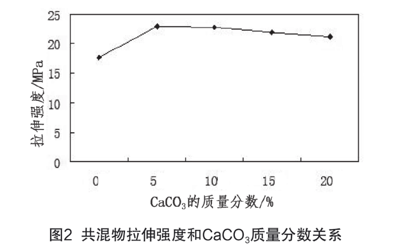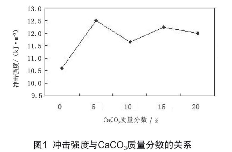 當(dāng)碳酸鈣的質(zhì)量分?jǐn)?shù)在5%左右時,各項(xiàng)性能都能達(dá)到最佳,沖擊性能提高了將近20%,拉伸性能也略有提高。