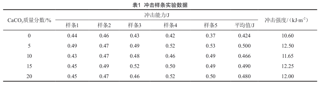 碳酸鈣質(zhì)量分?jǐn)?shù)為0%、5%、10%、15%、20%的ABS/CaCO3共混物的沖擊實(shí)驗(yàn)數(shù)據(jù)如表1所示。