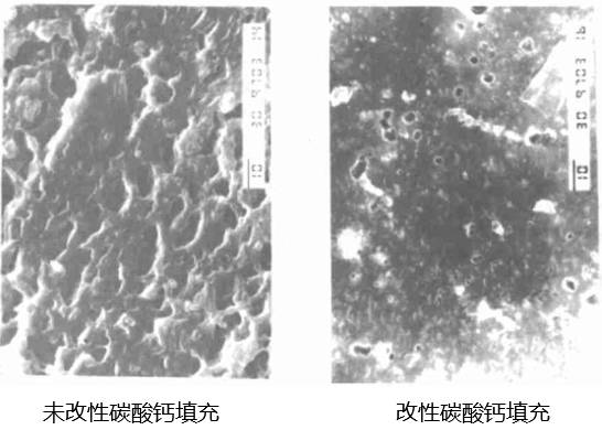改性碳酸鈣的補強性能要遠遠優(yōu)于未改性碳酸鈣,其補強性主要是由于表面改性劑是具有兩親基團的有機物,即具有親水基團和親油基團,表面改性劑通過兩個基團將碳酸鈣和橡膠緊密結(jié)合在一起,這有利于提高橡膠的物理機械性能,改善加工性能,并提高制品的延伸性、拉伸強度、撕裂強度等性能。
