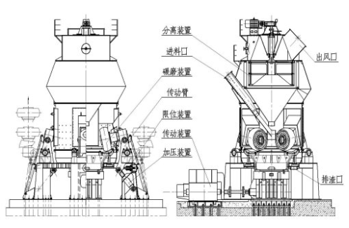 立式輥輪磨機(簡稱立式磨)的粉磨機理與雷蒙磨類似,均屬于碾壓粉碎,由于磨輥的施壓是采用高壓液壓方式,磨輥對物料的碾壓壓力增大數(shù)十倍甚至更大,所以其粉碎效率遠遠好于雷蒙磨。目前是大規(guī)模生產(chǎn)重鈣的主流設(shè)備之一
