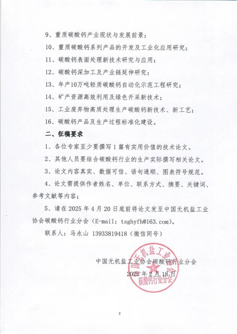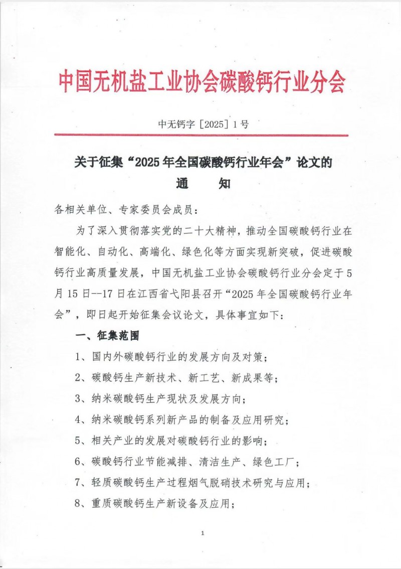 中國無機(jī)鹽工業(yè)協(xié)會(huì)碳酸鈣行業(yè)分會(huì)關(guān)于征集“2025年全國碳酸鈣行業(yè)年會(huì)”論文的 通知